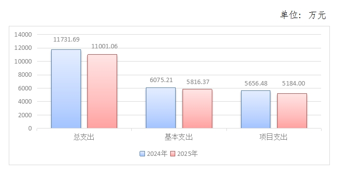 2025年支出總預(yù)算11001.06萬(wàn)元,同比減少730.63萬(wàn)元,下降6.23%。其中:基本支出預(yù)算5816.37萬(wàn)元,占支出總預(yù)算52.87%,同比減少258.84萬(wàn)元,下降4.26%;項(xiàng)目支出預(yù)算5184.69萬(wàn)元,占支出總預(yù)算47.13%,同比減少471.79萬(wàn)元,下降8.34%。