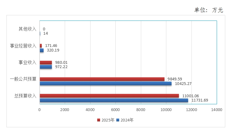 2025年收入總預(yù)算11001.06萬(wàn)元,同比減少730.63萬(wàn)元,下降6.23%。其中:一般公共預(yù)算撥款9849.59萬(wàn)元,同比減少575.68萬(wàn)元,下降5.52%;政府性基金預(yù)算收入0萬(wàn)元;國(guó)有資本經(jīng)營(yíng)預(yù)算收入0萬(wàn)元;財(cái)政專戶管理的收入0萬(wàn)元;單位資金收入1151.47萬(wàn)元,同比減少154.95萬(wàn)元,下降11.86%;上年結(jié)轉(zhuǎn)結(jié)余收入0萬(wàn)元。